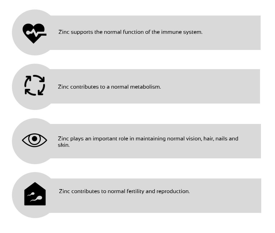 Zinc is one of the most important essential trace elements for humans, but cannot be produced by the body itself. In addition, zinc can only be stored in the body for a short time, so it must be regularly absorbed through food. Zinc is involved in a variety of processes in the body as well as in the activity of around 100 enzymes, and plays an important role in cell growth and wound healing as well as in the immune system and reproduction.