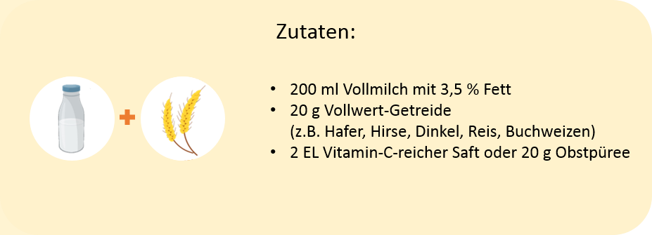 Experten empfehlen pasteurisierte und ultrahocherhitzte Vollmilch oder H-Milch mit 3,5 % Fett oder Säuglingsmilch zu verwenden.