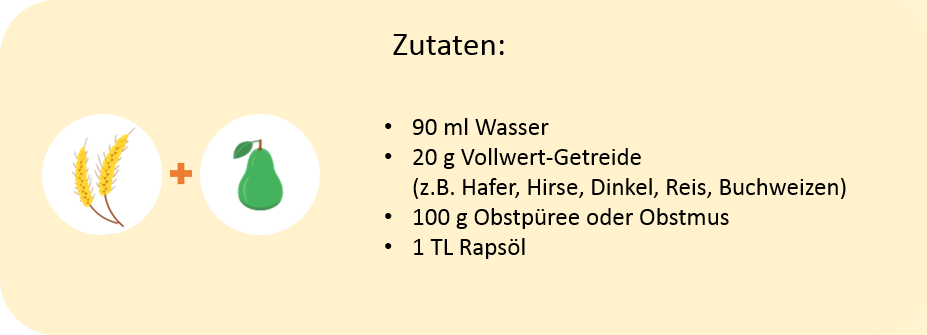 Der dritte Brei wird ca. einen Monat nach Einführung des Milch-Getreide-Breis zum Speiseplan hinzugefügt. Dieser ersetzt nun zusätzlich die Nachmittagsmahlzeit. Wichtig zu beachten ist, dass dem Brei keine Milch oder Milchprodukte hinzugefügt werden, um eine Balance zu den anderen beiden eiweißreichen Breimahlzeiten zu bilden und die Eisenaufnahme zu begünstigen. Spätestens jetzt braucht das Baby auch zusätzlich Flüssigkeit zu jedem Brei. Zu Beginn der Beikost sollte Ihr Kind 200 ml pro Tag trinken und gegen Ende des ersten Jahres etwa 400 ml pro Tag. Hierfür eigenen sich Trinkwasser oder ungesüßter Kräuter- und Früchtetee.