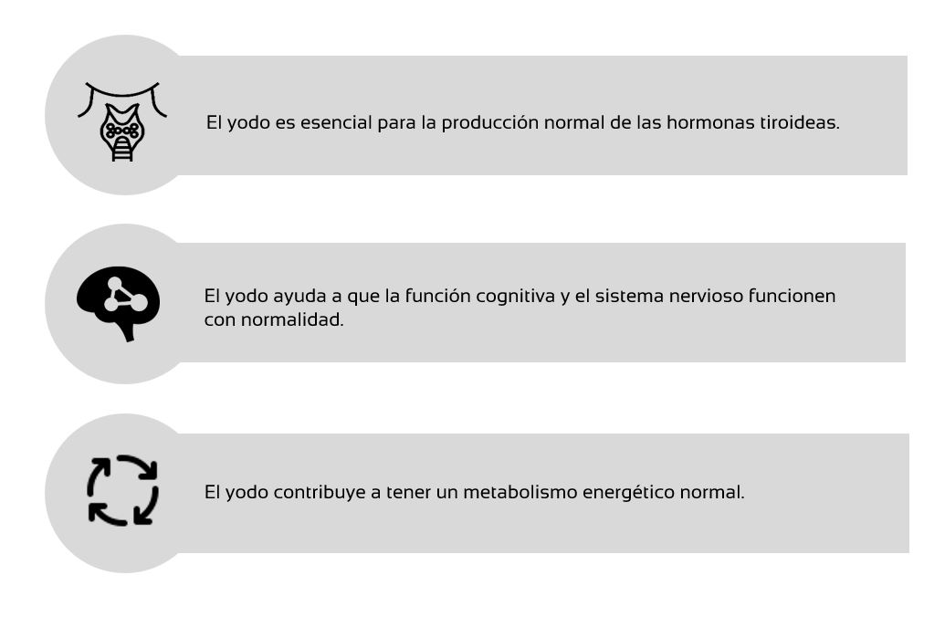 El yodo es un oligoelemento esencial de vital importancia y un componente sustancial de las hormonas tiroideas. Dichas hormonas regulan gran cantidad de procesos importantes del cuerpo, como el metabolismo energético, la ostogénesis y el desarrollo del cerebro. Según la Organización Mundial de la Salud, más de 50 países del mundo todavía no cuentan con un suministro suficiente de yodo. Por este motivo, muchos países enriquecen su sal de cocina con yodo.