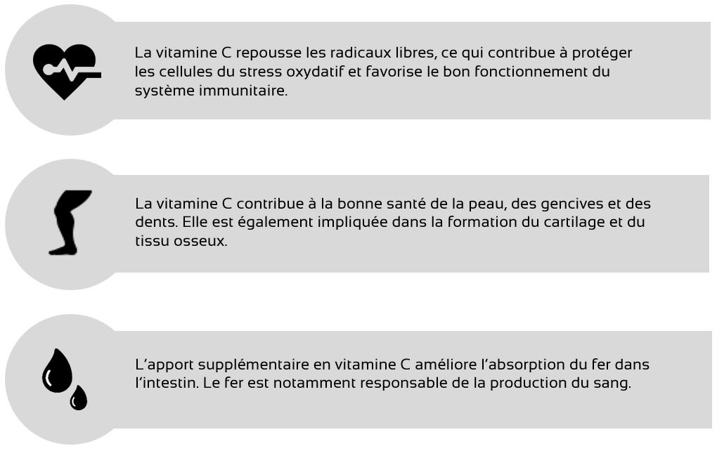 La vitamine C, également appelée acide ascorbique, assure de nombreuses fonctions essentielles pour l’organisme. Cette vitamine hydrosoluble ne peut cependant pas être produite par le corps lui-même. Jusqu’au 18e siècle, les marins en particulier ont souvent contracté le scorbut, une maladie potentiellement mortelle, en raison d’une forte carence en vitamine C. Aujourd’hui, les besoins quotidiens peuvent généralement être couverts par une alimentation riche en fruits et légumes.