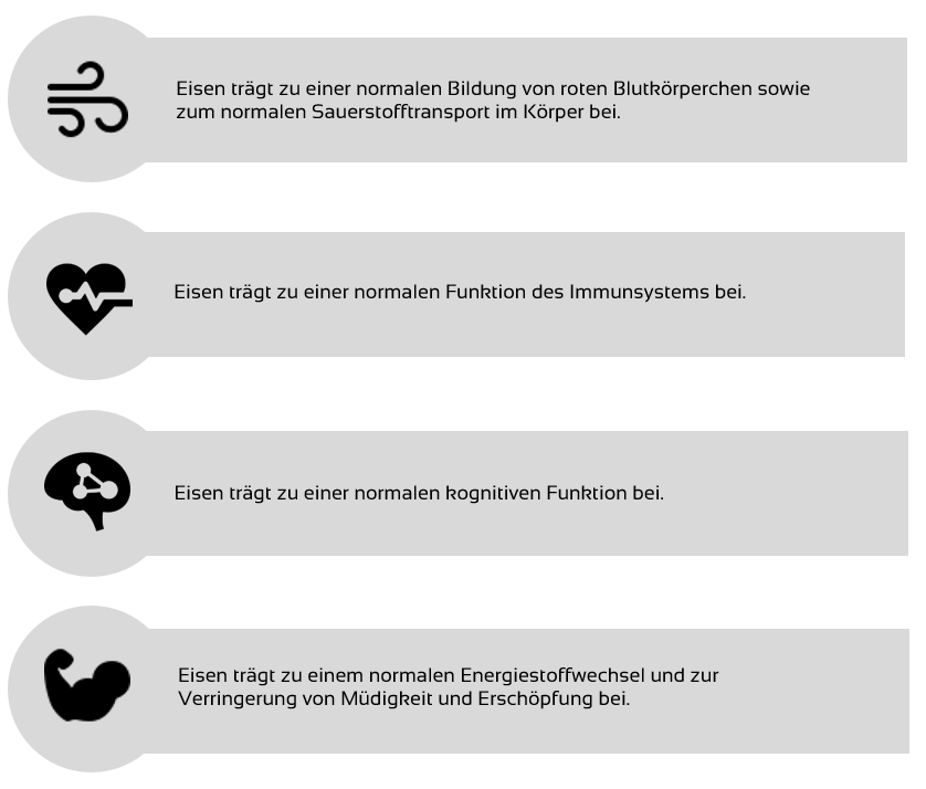 Als Bestandteil des roten Blutfarbstoffs Hämoglobin ist Eisen insbesondere für den Sauerstofftransport im Körper verantwortlich. Eisen kann in der Leber, in der Milz, im Knochenmark und in der Muskulatur gespeichert werden. Der menschliche Körper kann Eisen nicht selbst produzieren, sondern muss es über die Nahrung aufnehmen. Laut WHO zählt Eisenmangel weltweit zu den häufigsten Mangelerscheinungen.