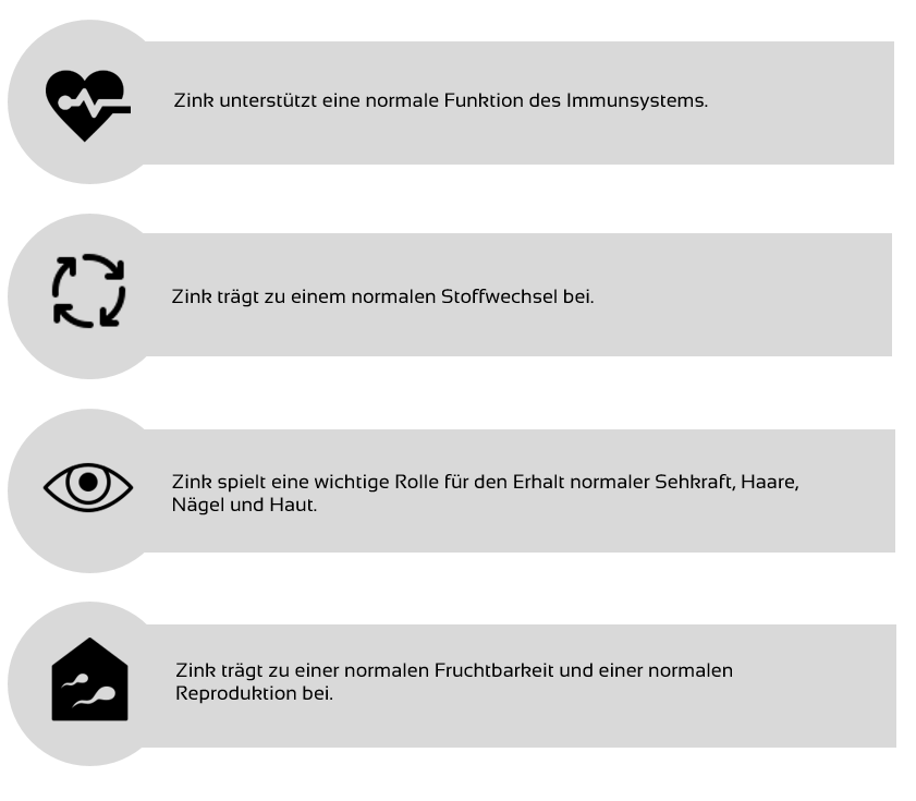 Zink ist eines der wichtigsten essentiellen Spurenelemente für den Menschen, kann aber nicht vom Körper selbst gebildet werden. Die Speicherung von Zink im Körper ist darüber hinaus nur kurzzeitig möglich, daher muss es regelmäßig über die Nahrung aufgenommen werden. Zink ist an einer Vielzahl von Prozessen im Körper sowie an der Aktivität von etwa 100 Enzymen beteiligt, spielt für das Zellwachstum und die Wundheilung sowie für das Immunsystem und für die Fortpflanzung eine wichtige Rolle.